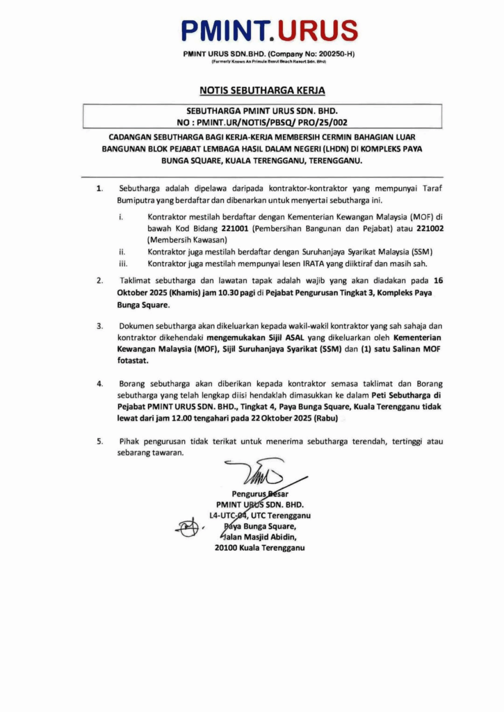 Untuk makluman satu taklimat dan lawatan tapak akan diadakan pada 16 Oktober 2025 (Khamis) pada jam 10.30pagi bertempat di Pejabat Pengurusan PMINT Urus Sdn Bhd, Tingkat 4 Kompleks Paya Bunga Square.