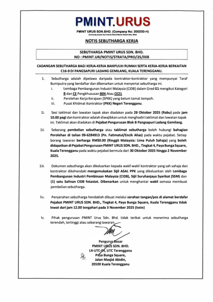 PMINT Urus Sdn. Bhd. mengadakan 𝗦𝗘𝗕𝗨𝗧 𝗛𝗔𝗥𝗚𝗔 𝗧𝗘𝗥𝗕𝗨𝗞𝗔 bagi:-